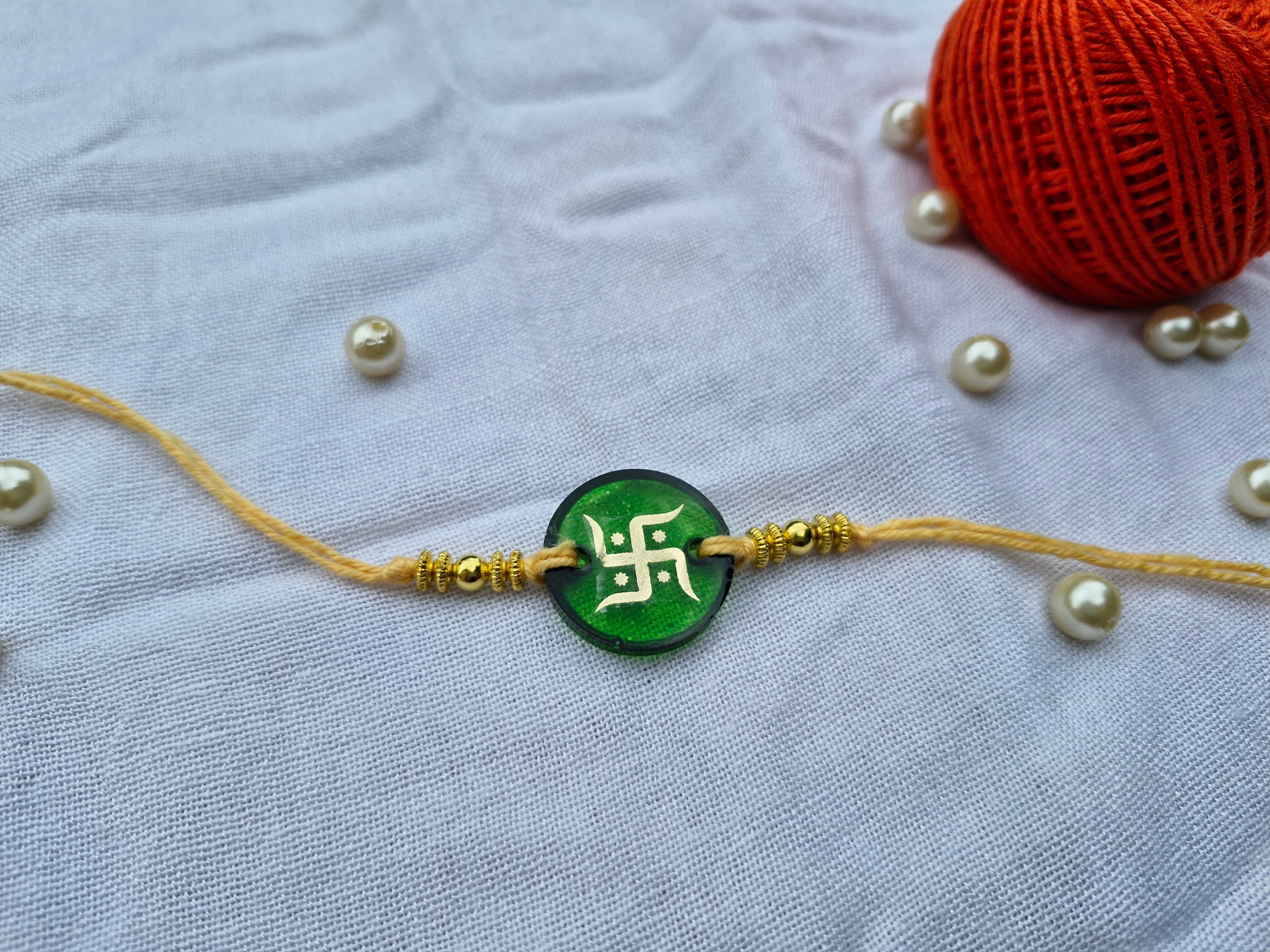 Auspicious Swastik Rakhi – Green Resin with Golden Thread & Beads